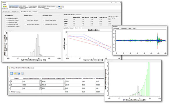 VATS is available for either hand-arm or whole body analysis. Hand-arm vibration analysis is based on the ISO 5349 and ACGIH standard for hand arm vibration (HAV). Whole body vibration analysis is based on the ISO 2631-1, 2631-5 (2004), 2631-5 (2018), BS 6841, and ACGIH standard for whole body vibration (WBV) and 8 hours exposure.